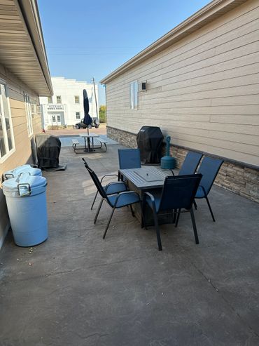 The lodge holds a living room, a spacious common area with a bar, and a large dining room. Outside, you will find a deck and courtyard area to enjoy.
